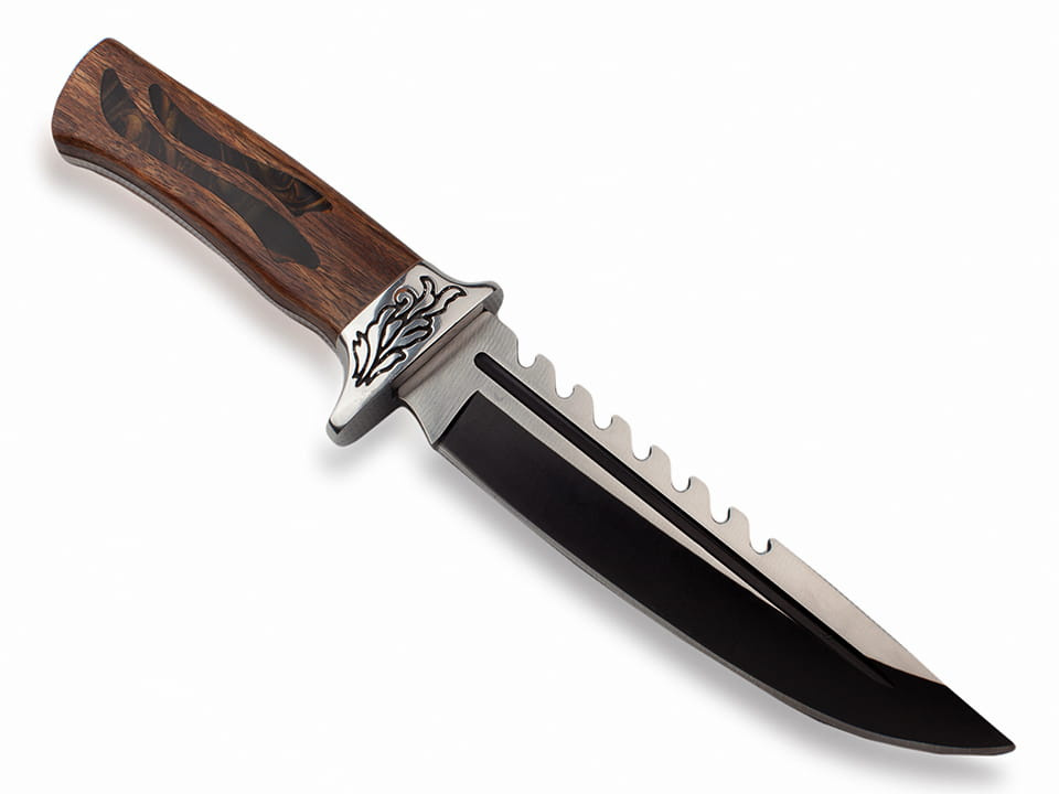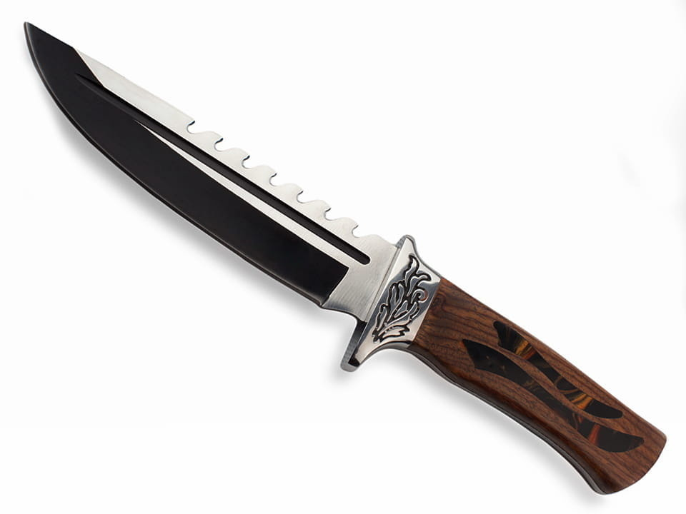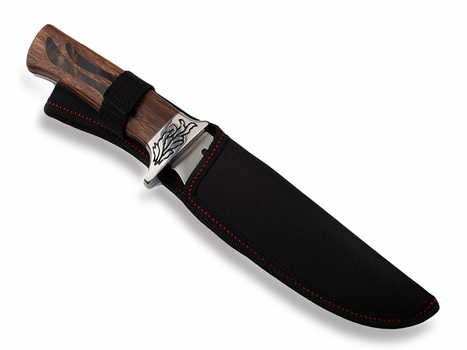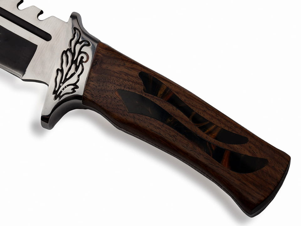 Wielki, potężny nóż myśliwski z przepięknymi zdobieniami.