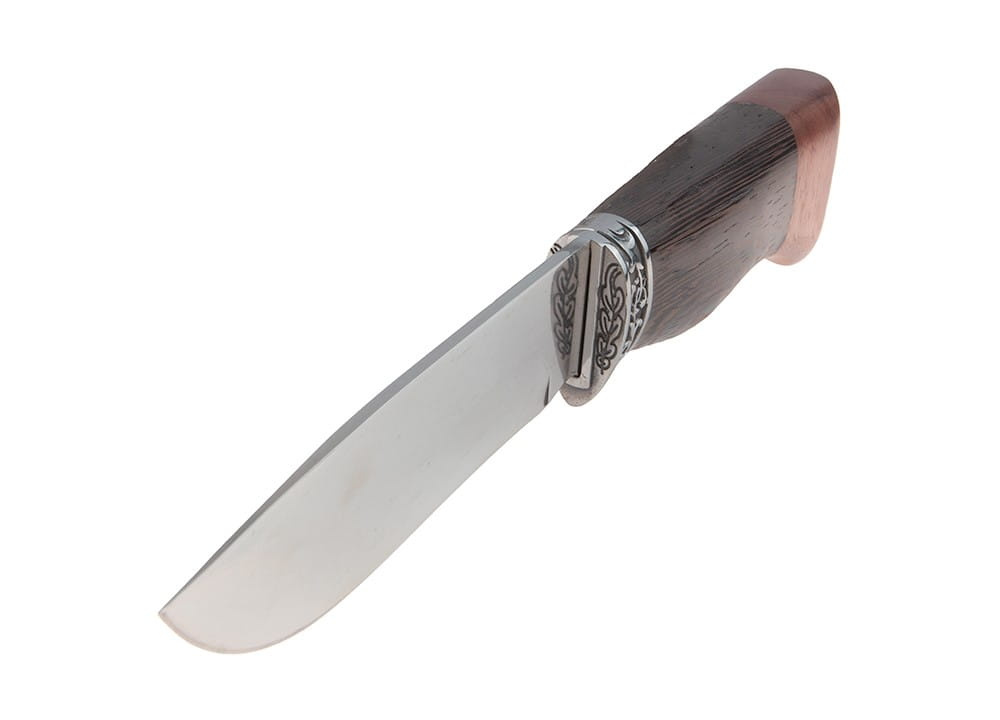 Rękojeść posiada delikatny, zdobiony myśliwskimi ornamentami jelec, który zapobiega zsunięciu się dłoni na krawędź tnącą.