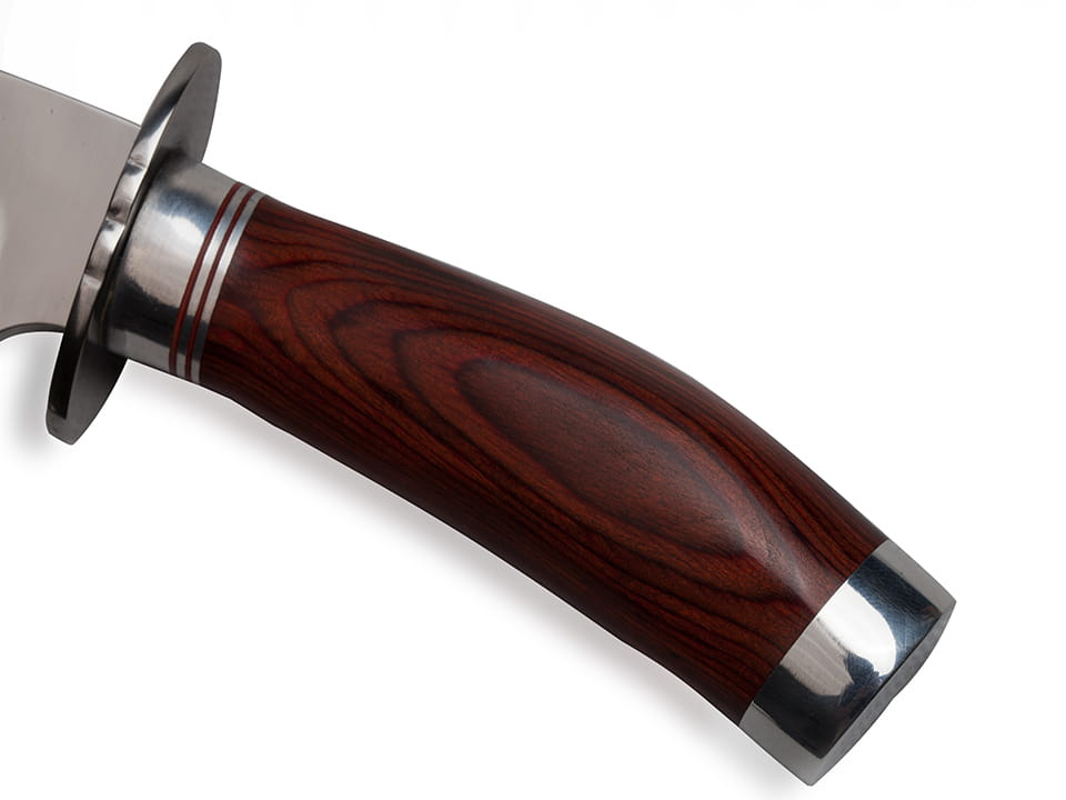 Metalowy jelec świetnie chroni dłoń przed możliwością zsunięcia się w stronę powierzchni tnącej.