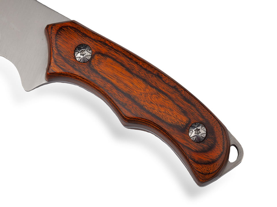 Wygodna, ergonomiczna rękojeść została wykonana z dwóch drewnianych okładzin przymocowanych do wewnętrznego monolitu za pomocą stalowych śrub.