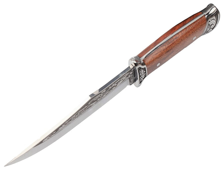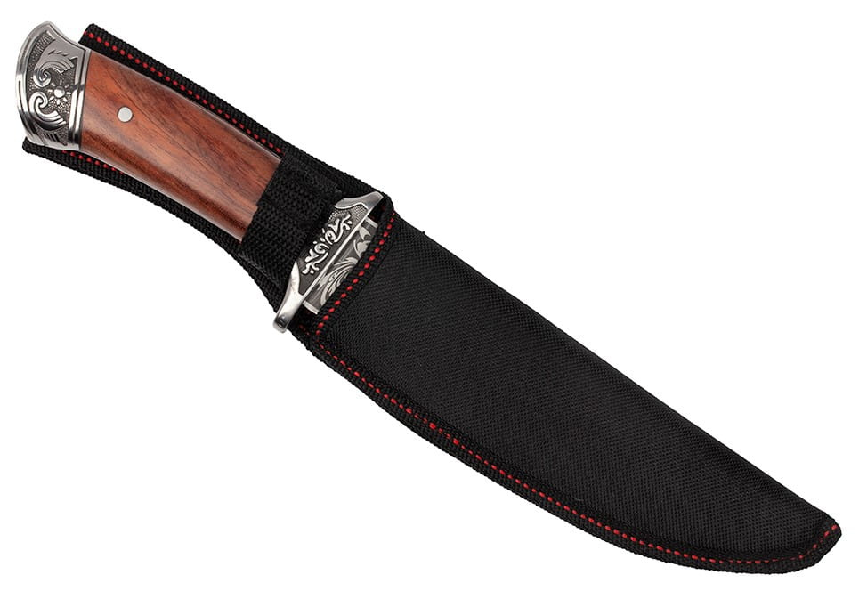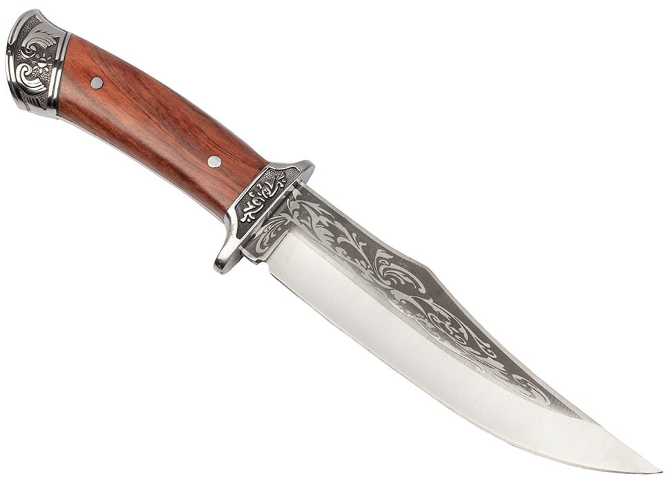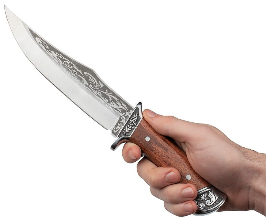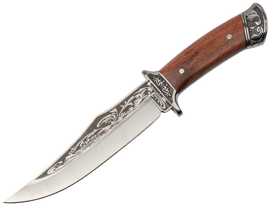 Solidnie wykonany, niezastąpiony nóż myśliwski z przepięknymi zdobieniami.