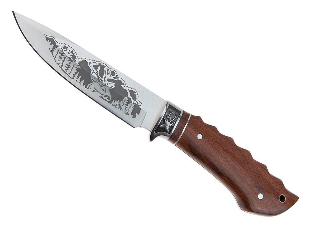 Metalowy jelec z dekorem w postaci głowy jelenia, zabezpiecza dłoń przed niepożądanym osunięciem się w stronę krawędzi tnącej.