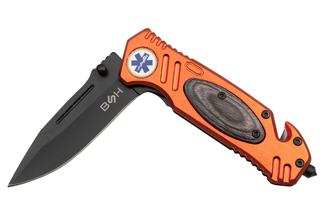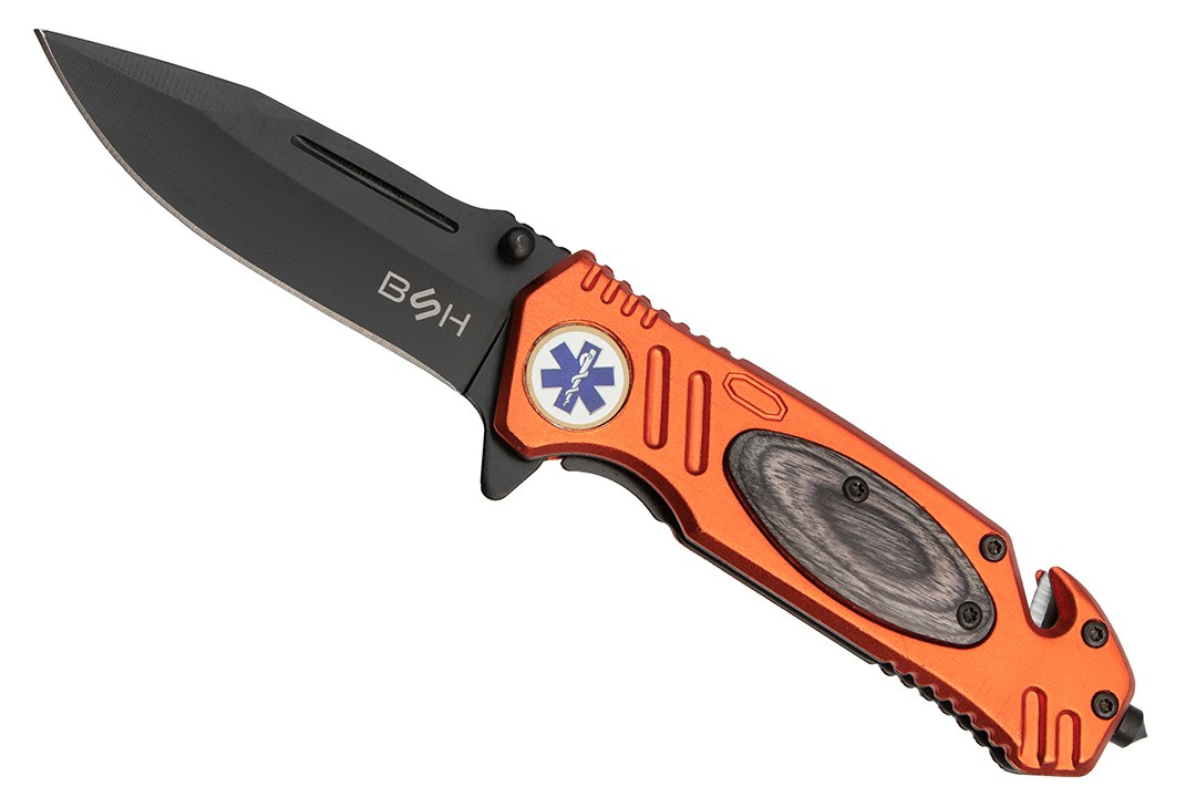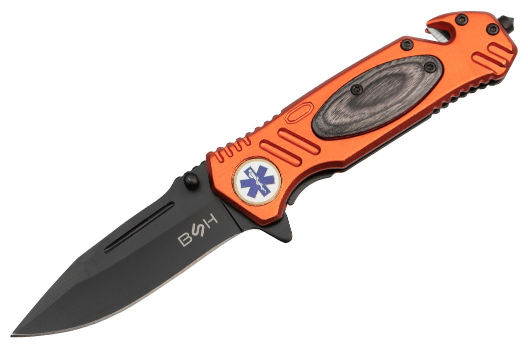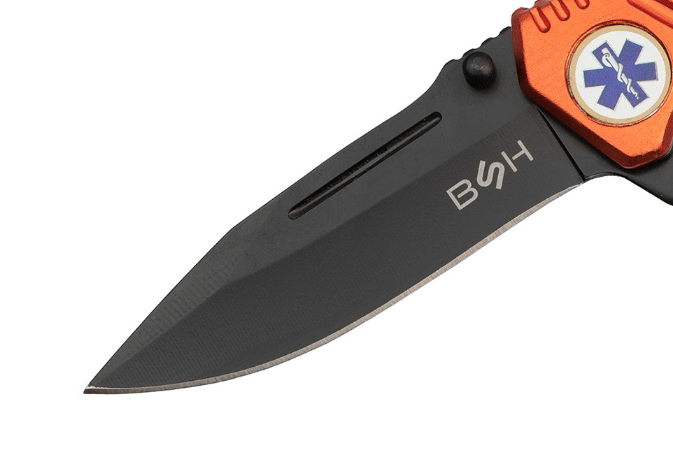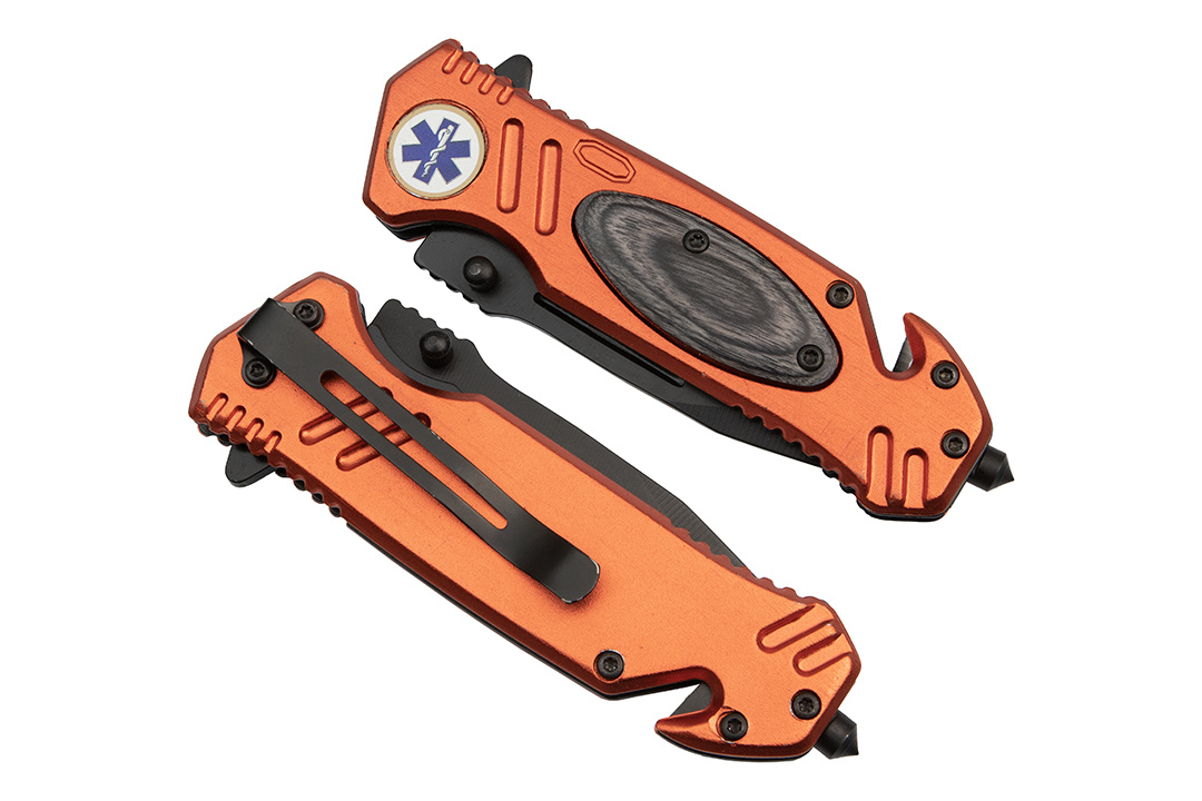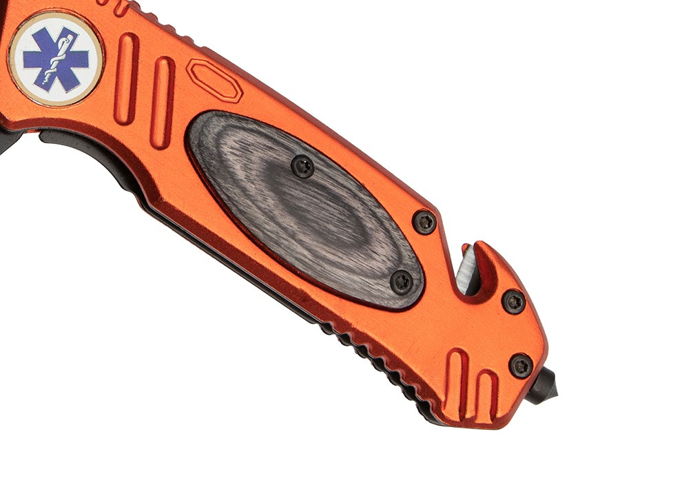 Nóż sprężynowy jest utrzymany w stylistyce ratunkowej, posiada odblaskowe, pomarańczowe okucia z aluminium oraz gwiazdę życia.