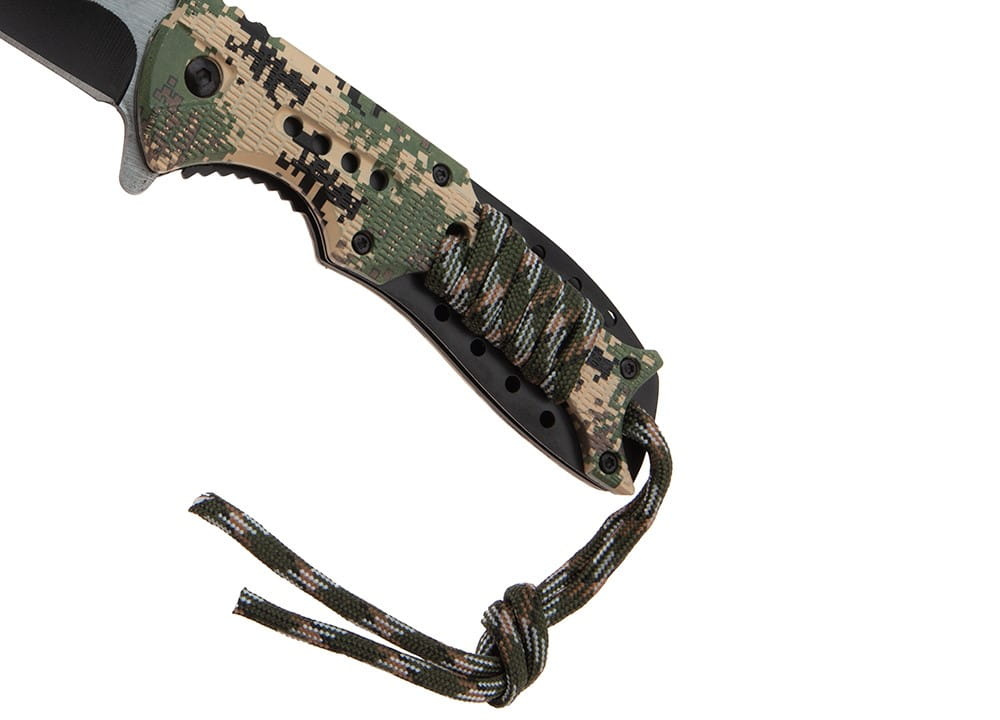 Rękojeść oraz linka są w kolorze wojskowego kamuflażu.