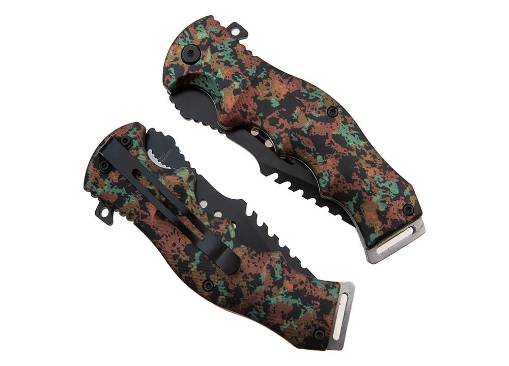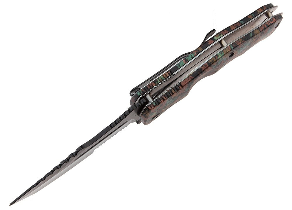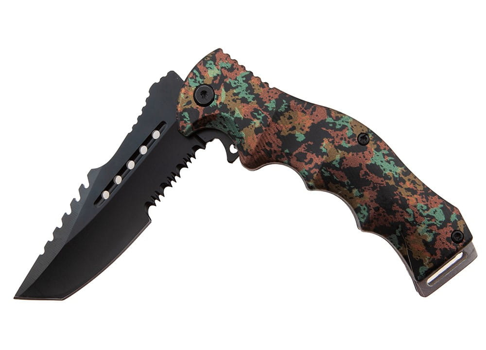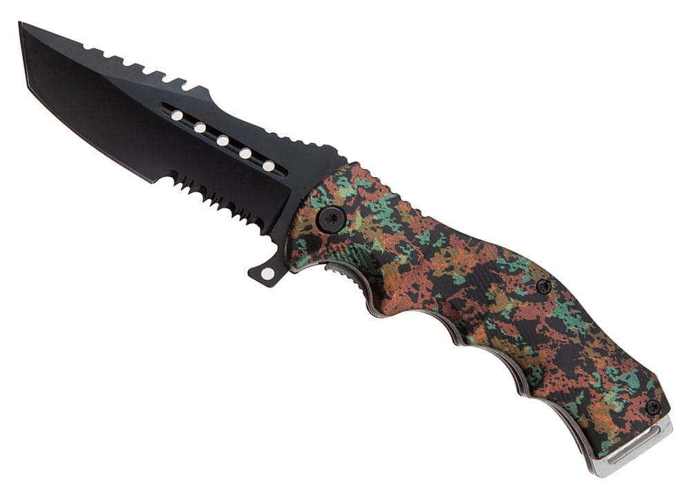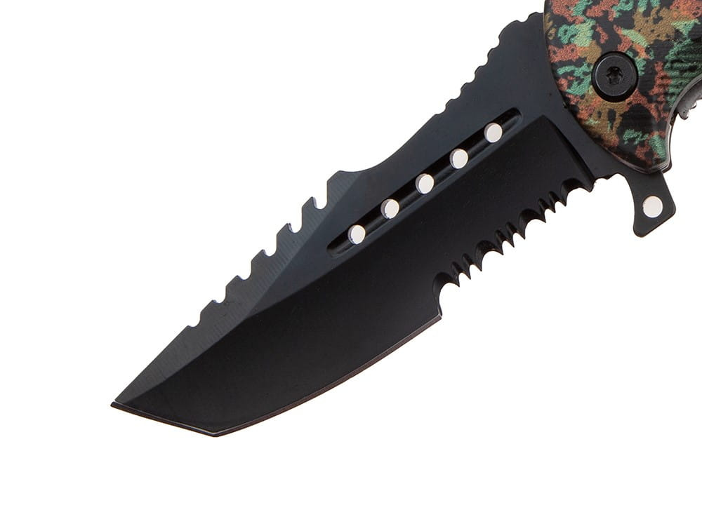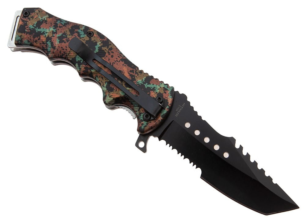 Agresywny z wyglądu wojskowy nóż składany do zadań specjalnych.