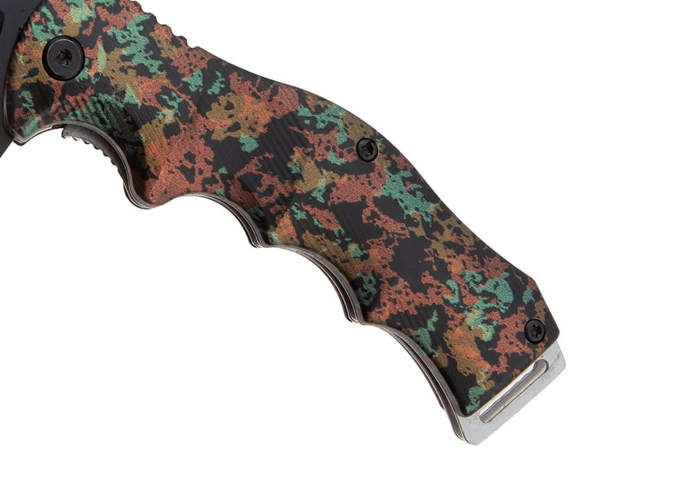 Ergonomicznie profilowana rękojeść w kolorze moro została wykonana z odpornego i lekkiego tworzywa.
