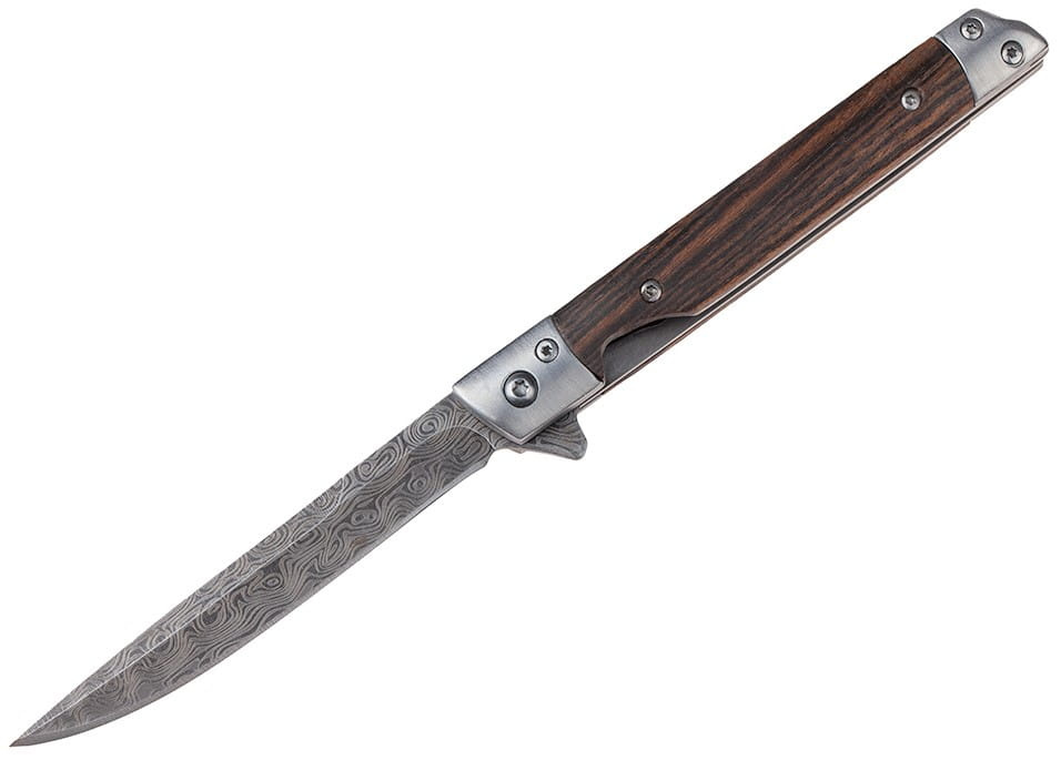 Nóż sprężynowy posiada wydłużoną głownię o profilu clip point wykonaną ze stali nierdzewnej 420.
