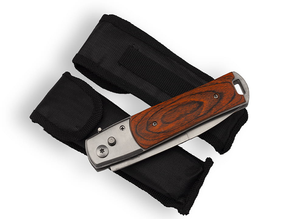 Klasyczny nóż sprężynowy posiada zgrabny pokrowiec, który można przymocować do paska spodni tak, by nóż zawsze był pod ręką.