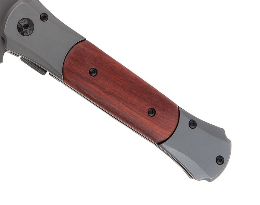 Ergonomiczna rękojeść została wykonana z metalu obłożonego drewnianymi okładzinami.