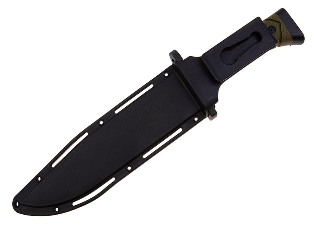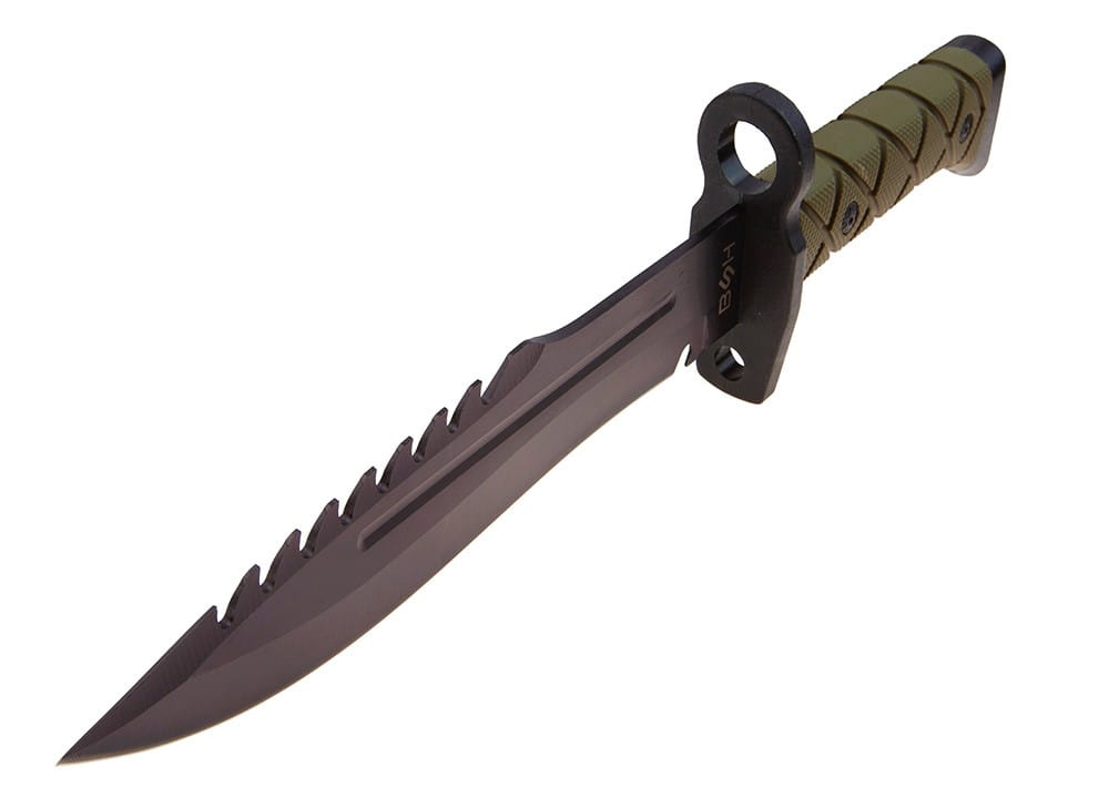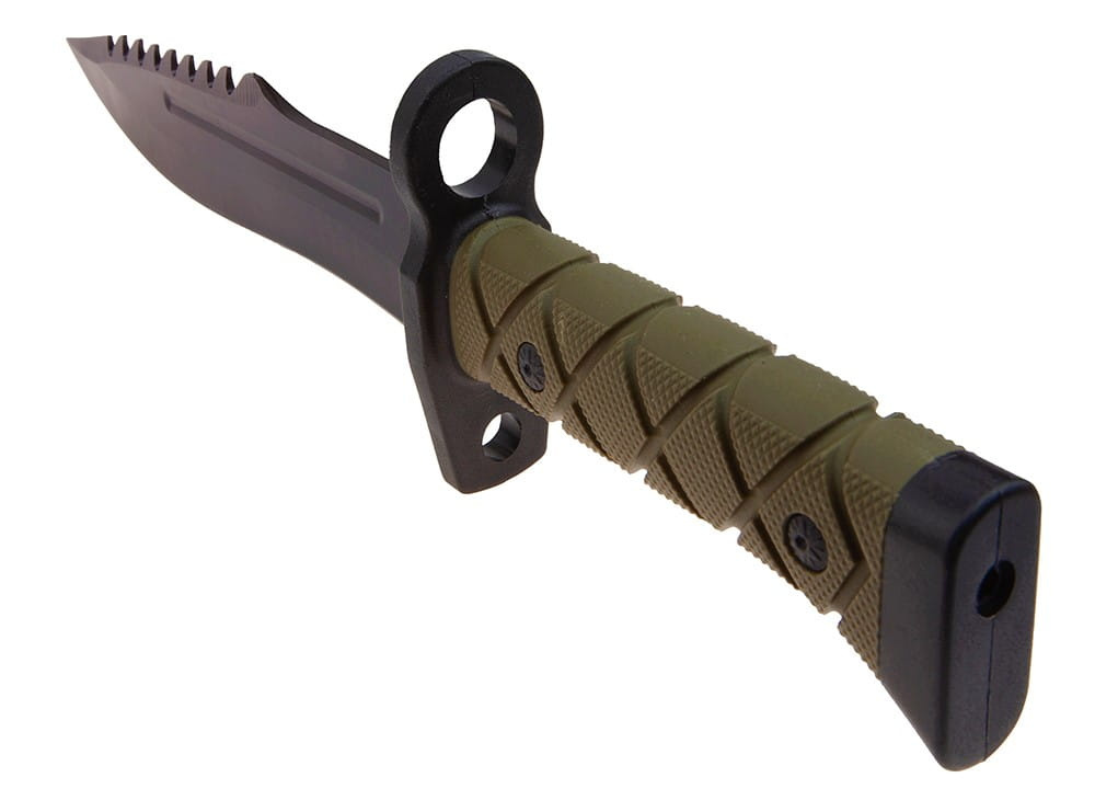 Szeroki jelec przypominający element bagnetu, skutecznie chroni dłoń przed niepożądanym zsunięciem się w stronę krawędzi tnącej.