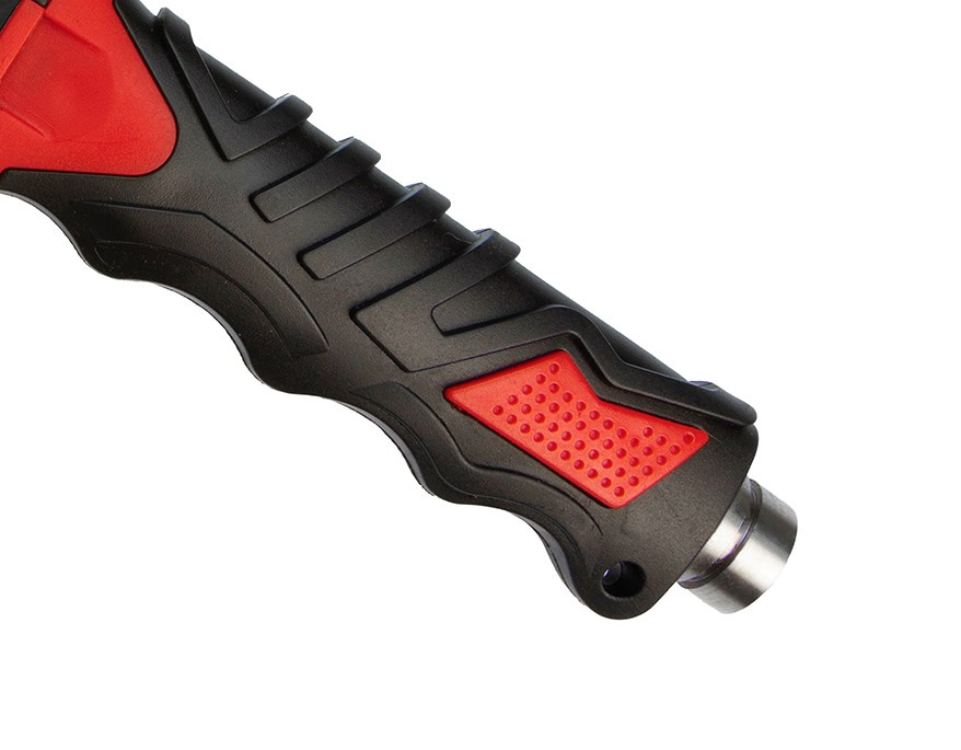 Ergonomiczna, antypoślizgowa rękojeść z akcentami w kolorze czerwonym, została wykonana z połączenia niezwykle odpornego na uszkodzenia tworzywa ABS i tworzywa gumopodobnego.