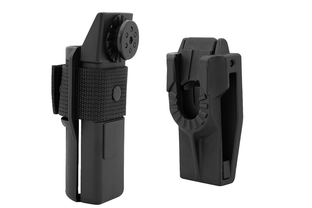 UBC-05 - uniwersalne mocowanie na pas (Quick Change System) z mechanizmem wsuwania umożliwiające szybką wymianę uchwytu na pałkę na inne wyposażenie z mechanizmem rotującym. Mocowanie pozostaje na pasie - wystarczy wybrać nową kaburę i zamocować ją.