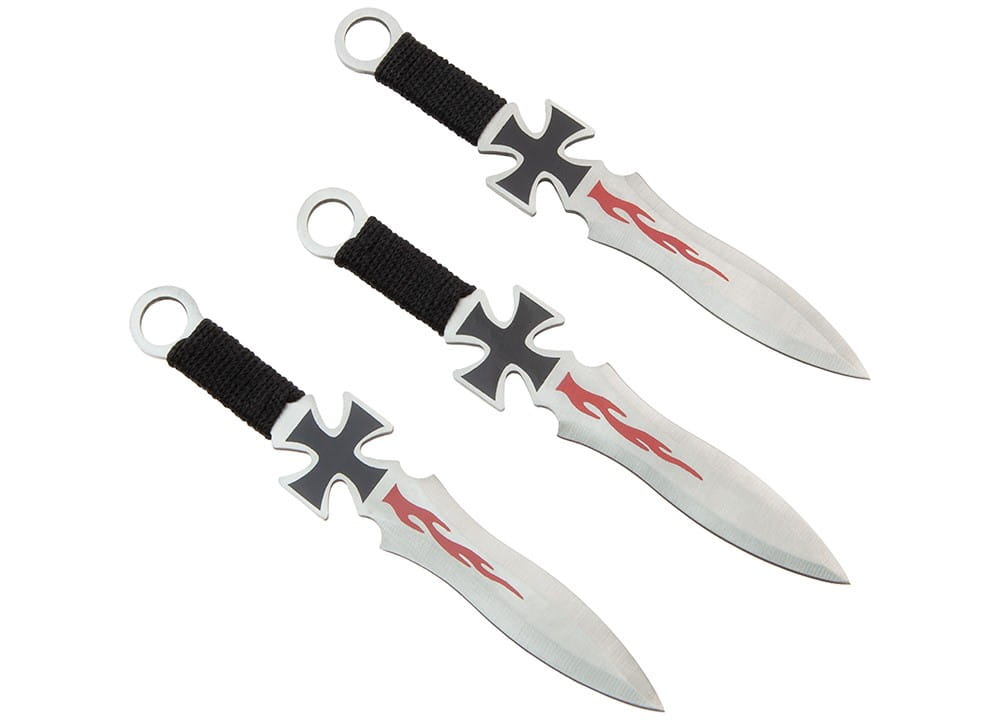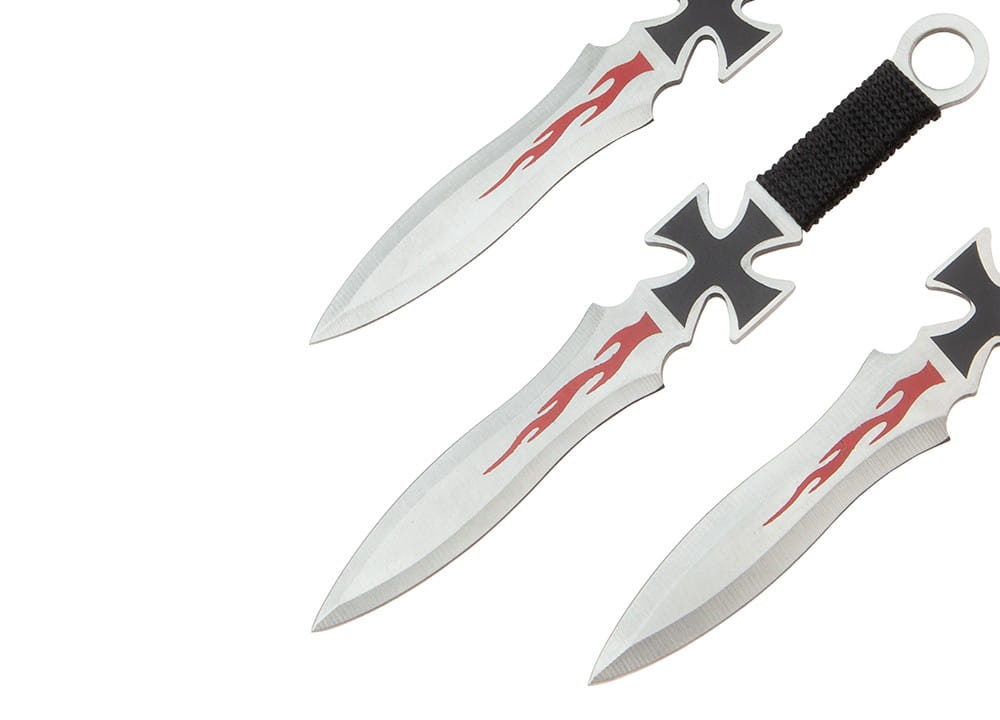 Rzutki posiadają zdobienia w formie malowanych płomieni na głowni oraz czarny krzyż w miejscu jelca.