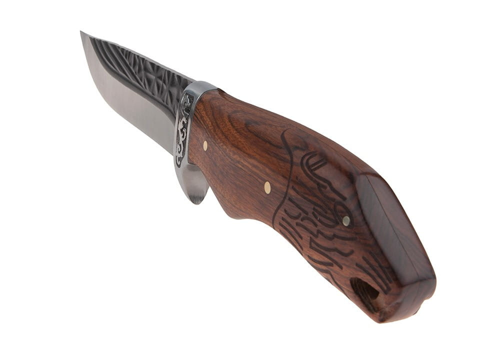 Pięknie zdobiona głownia o profilu trailing point została wykonana z wysokojakościowej stali nierdzewnej 440, bardzo wytrzymałej na stępienie i łatwej do ostrzenia.