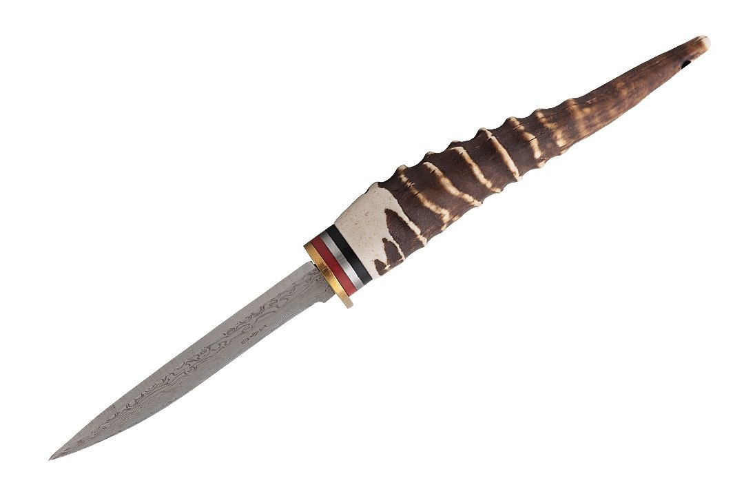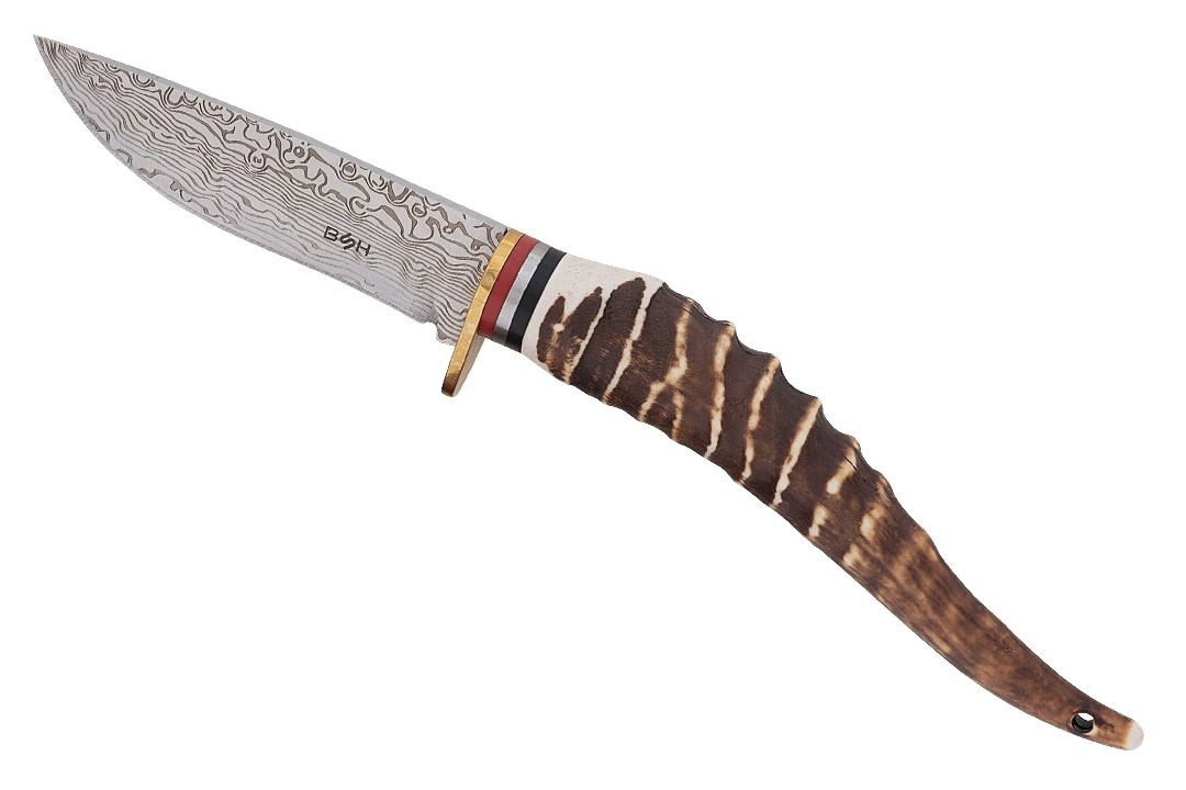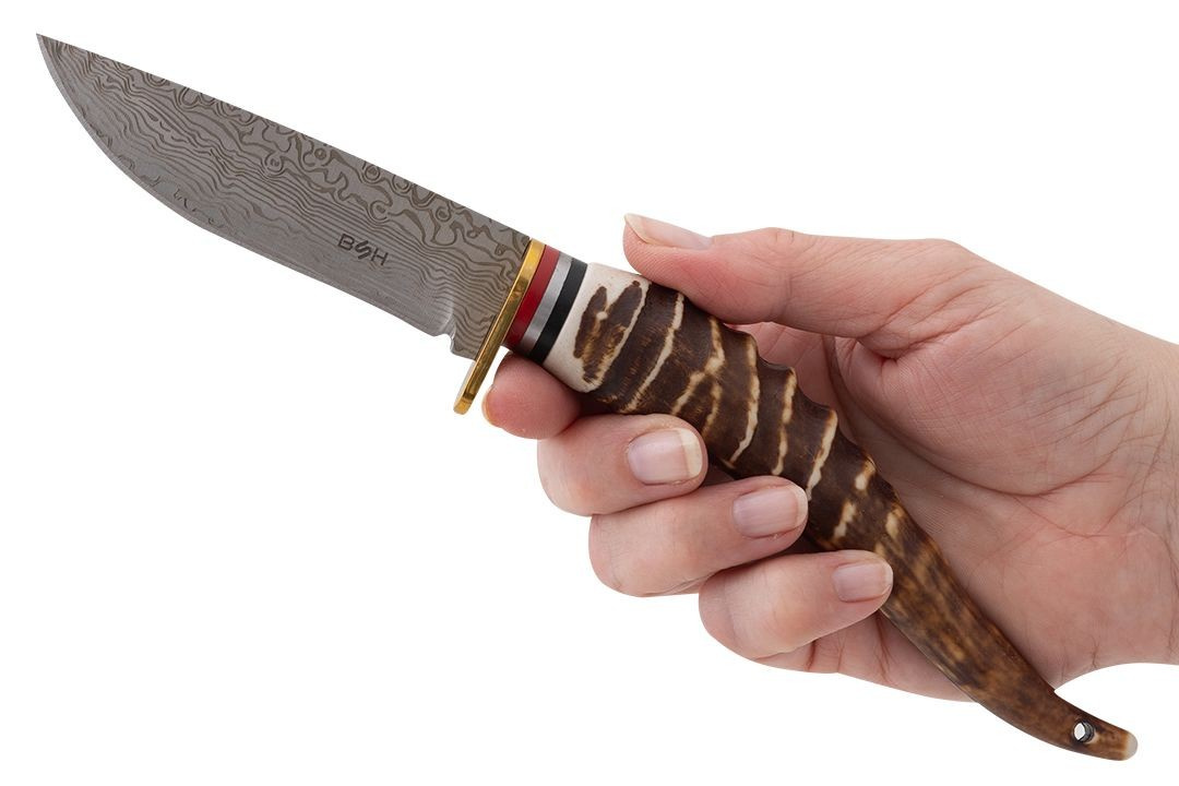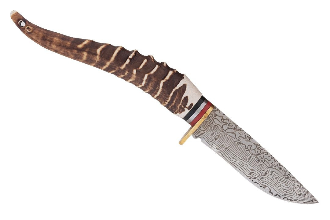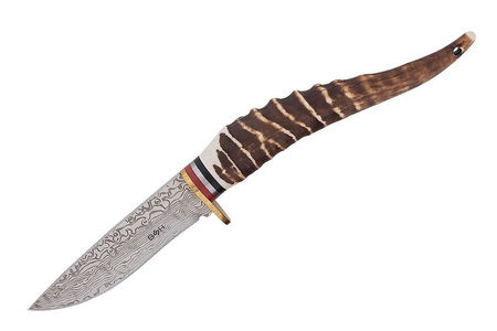 Przepiękny nóż myśliwski imitujący stal damasceńską oraz poroże jelenia prezentuje się wyjątkowo efektownie.