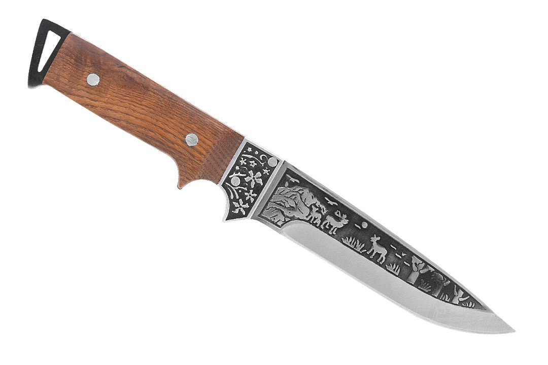 Głownia o profilu drop point została ozdobiona efektownym grawerem przedstawiającym jelenie na tle gór i lasów.