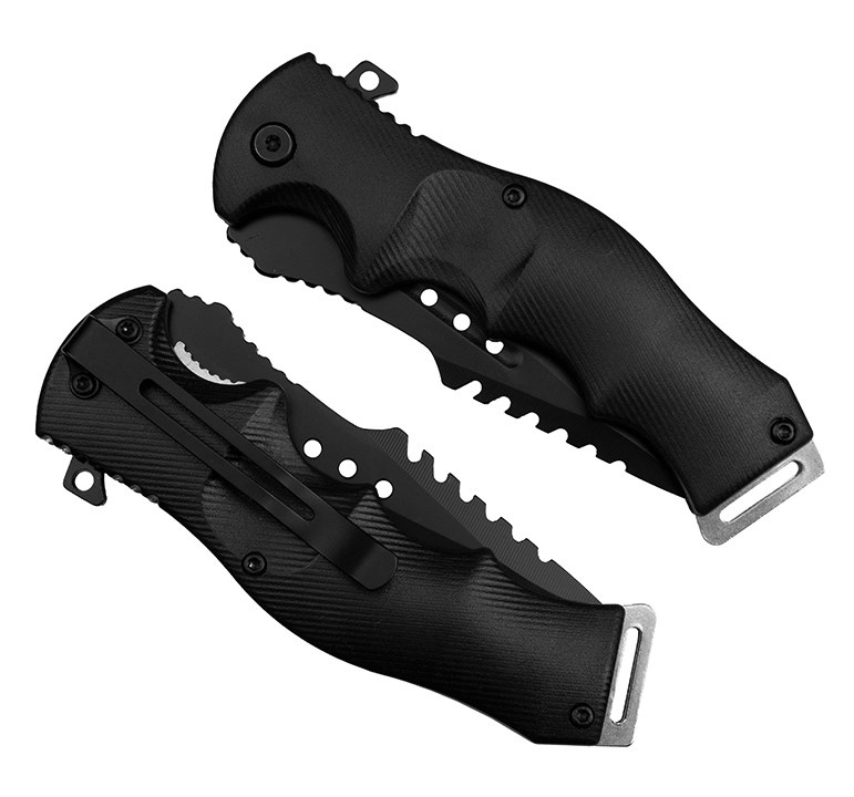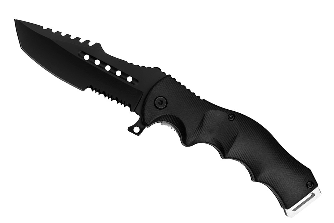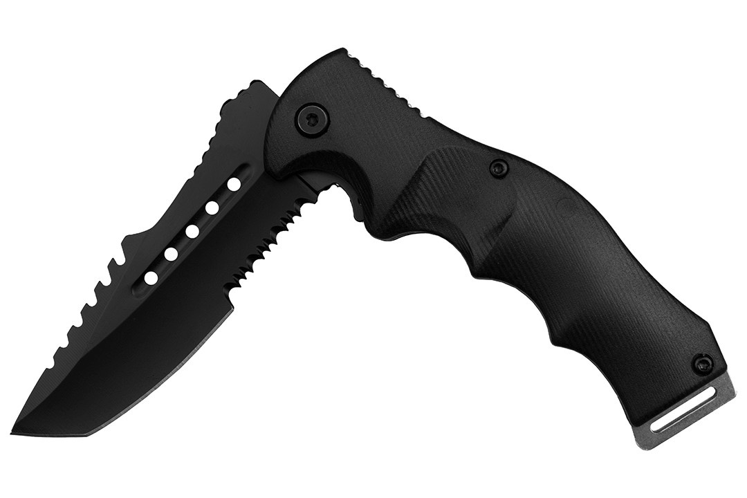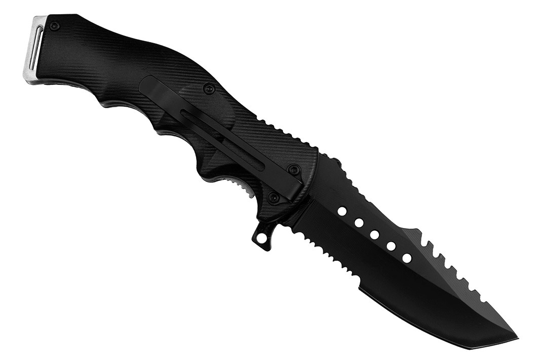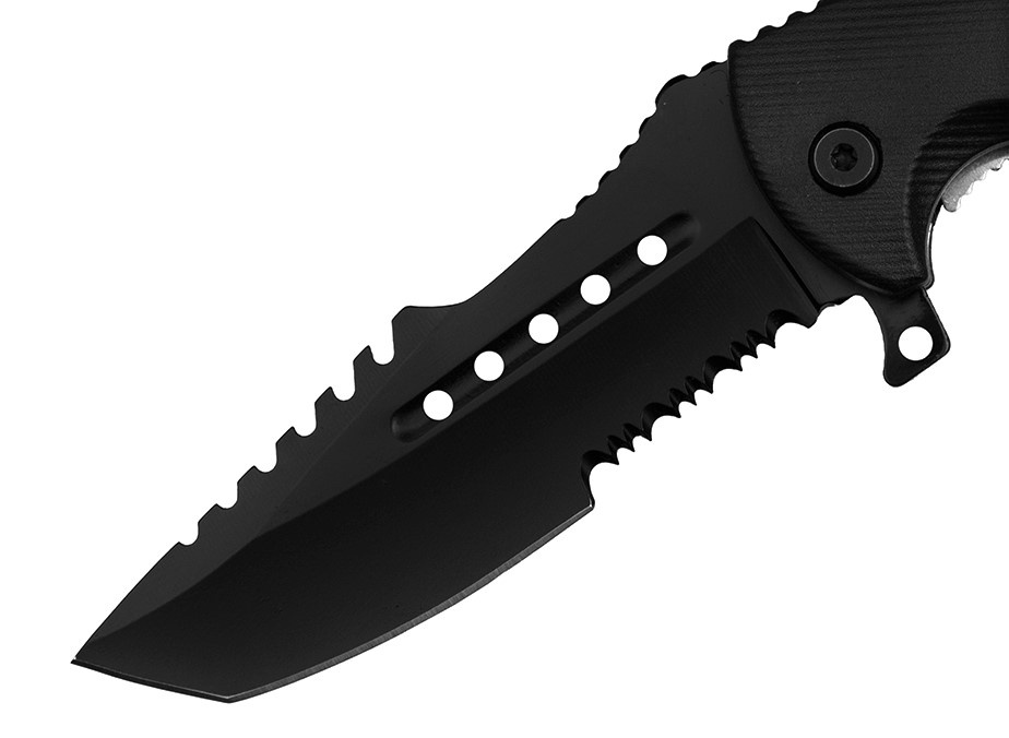 Agresywny z wyglądu wojskowy nóż składany do zadań specjalnych.