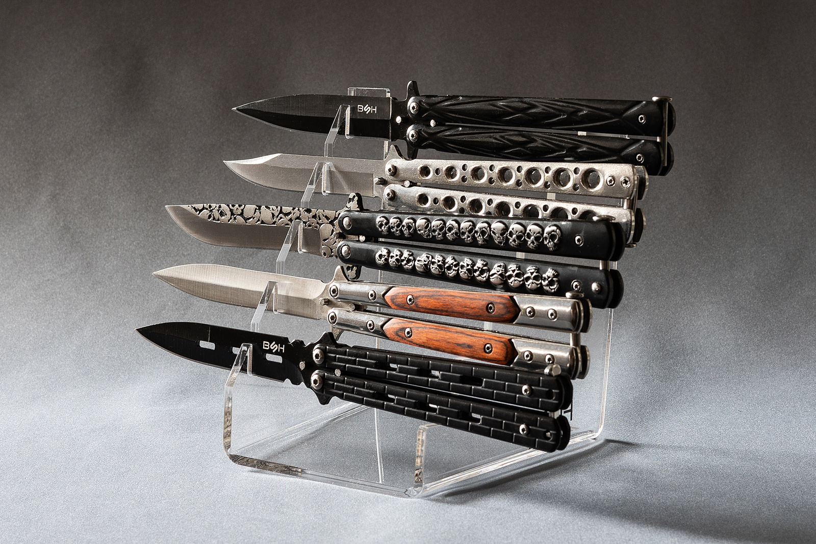 Stojak został stworzony z myślą o nożach motylkowych, karambitach oraz nożach treningowych – to właśnie z tymi typami współgra najlepiej, zapewniając im odpowiednie podparcie i atrakcyjną prezentację.