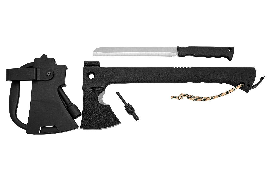 W dolnej części siekierki znajduje się otwór z przewleczoną linką, co zwiększa bezpieczeństwo noszenia i umożliwia zawieszenie siekiery na haku lub przy plecaku.